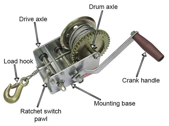 • Drive Axle: To operate the winch, you turn the handle, which sets the central drive axle in rotation. The axle then transfers this motion to the locking mechanism and gears; these components then drive the drum, enabling it to spool the cable.
